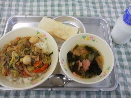 5月7日学校公開日の給食は、中華丼・ピーチパイ・すまし汁・牛乳でした。