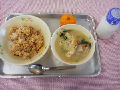 今日の献立は、キムタクチャーハン・みそすいとん・くだもの(冷凍みかん)・牛乳です。