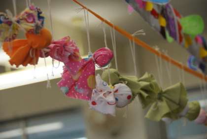 1年生の教室には、たくさんの照る照る坊主がつるしてあります。