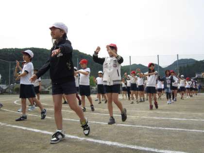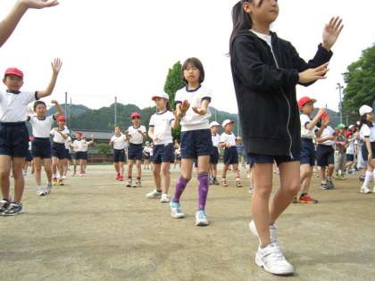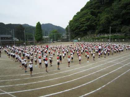 5月16日(月)児童集会では運動会の全校リズム「恩方音頭」の練習をしました。