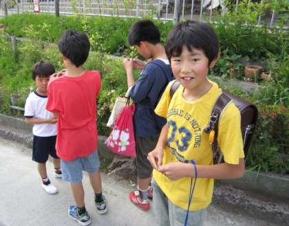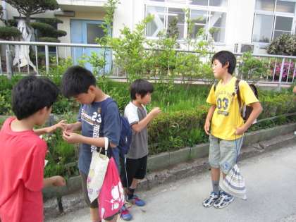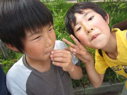 放課後、ピーピーいっているので、外に出てみると、草笛を吹いている5年生を見つけました。