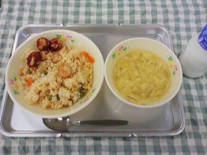 5月27日のこんだては、ジャンバラヤ・うずらのケチャップ煮・コーンとたまごのスープ・牛乳でした。