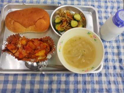 6月1日のこんだては、ダイスチーズパン・ポテトミートグラタン・オニオンスープ・ごぼうサラダ・牛乳でした。