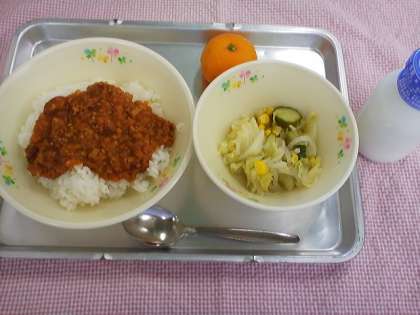 6月3日のこんだては、チリコンカンライス・フレンチサラダ・くだもの(冷凍みかん)・牛乳でした。