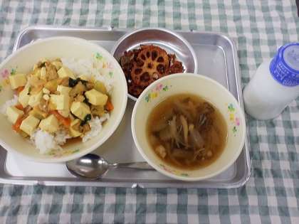 6月6日のこんだては、豆腐のカレー煮丼・中華風きのこスープ・れんこんチップス・牛乳でした。