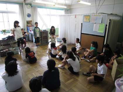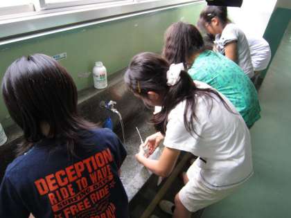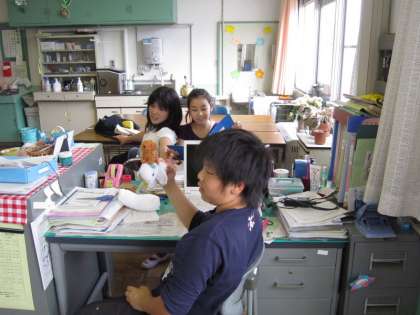 写真下は、作業も終わりリラックスする保健委員です。