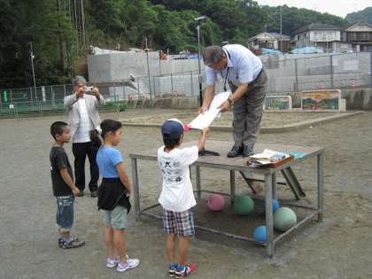 朝会で、あいさつ標語の表彰と、スポーツで頑張った児童の表彰が行われました。