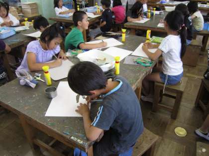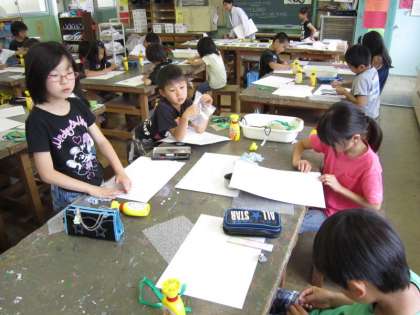 紙やボタン、毛糸など、様々な材料 を貼り付けたり 切ったり重ねたりして 版下を作ります。