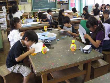 まず、材料を全部並べて 見通しを立ててから作品作りに取り組むグループがあったり、インスピレーションを大切にして、材料箱から取り出したものをどんどん並べてみるグループがあったりと様々で、見ていて面白かったです。