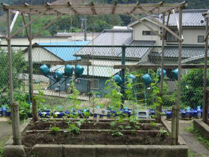 4年生のヘチマ棚。今年は、ゴーヤでしょうか? 風船かずらでしょうか? それともヘチマでしょうか?