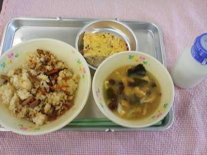 6月10日のこんだては、鶏ごぼうごはん・豆腐の真砂焼き・なめこ汁・牛乳でした。