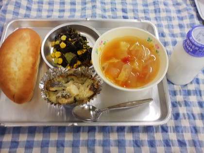 6月14日のこんだては、ソフトフランスパン・白身魚の香草焼き・海藻サラダ・ミネストローネ・牛乳でした。