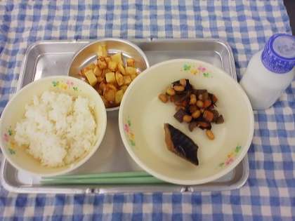 6月17日のこんだては、ごはん・鯖のみそ煮・五目煮豆・じゃがころ揚げ・牛乳でした。