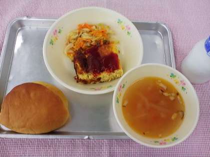 6月23日のこんだては、スパイシーサンドパン・スパニッシュオムレツ・イタリアンスープ・温野菜のカレーソス・牛乳でした。