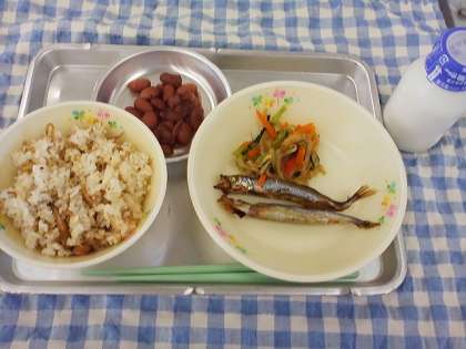 6月24日のこんだては、ごまじゃこごはん・焼きししゃも・煮びたし・金時豆の甘煮・牛乳でした。