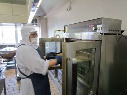 この日の献立に、焼き魚(ししゃも)や炒め物があったため、給食室内はとても蒸し暑かったです。