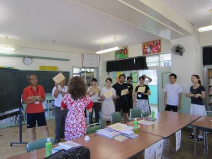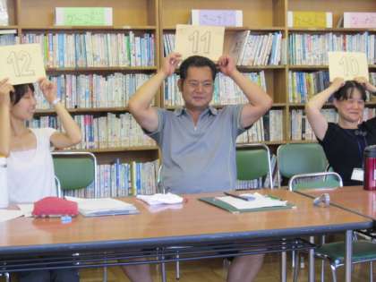 英語活動の授業に引き続き、図書室で研究協議会を行いました。