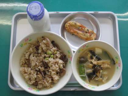 9月6日のこんだては、きのこごはん・笹かまぼこの南部揚げ・みそ汁・牛乳でした。