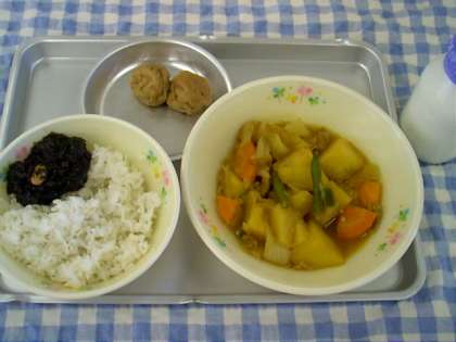 今日のこんだては、麦ごはん・のり豆・中華風肉じゃが・京がんもの煮物・牛乳です。