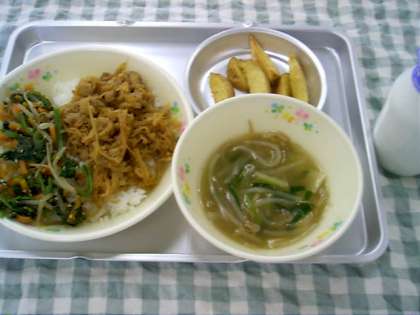 9月14日のこんだては、ビビンバ・エスニックスープ・ベークドポテト・牛乳です。