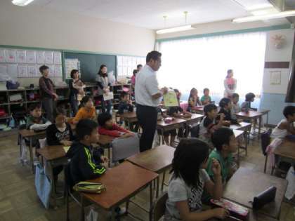 パソコンの画面と、テレビの画面、それに、渡部主幹教諭の読み聞かせ。