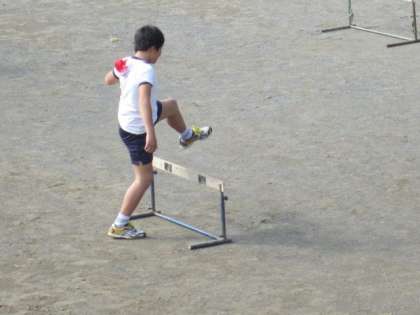 5年生のハードル走につなげるために、またぎ越す感覚を大切にしながら、何度も何度もハードルをクリアーしていました。