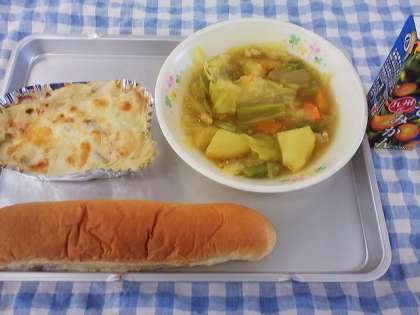 今日のこんだては、ミルクスティックパン・えびドリア・野菜のカレースープ煮・みかんジュースです。