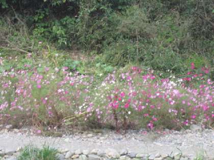 小田野中央公園の前を流れる北浅川の川岸にコスモスの花がきれいに咲いていました。
