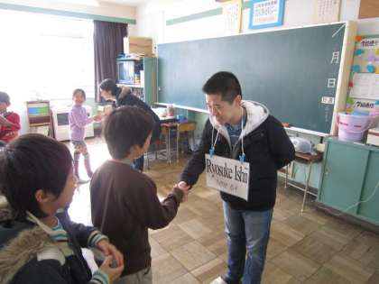 写真上:自己紹介 相手の目を見てしっかりあいさつ、がっちり握手!