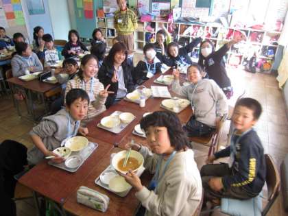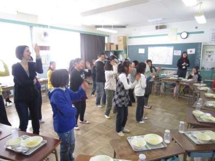 写真下:給食後、集会で踊るマカレナダンスも一緒に踊りました。