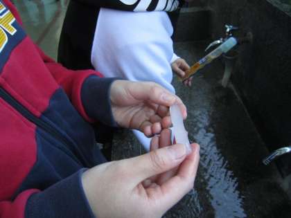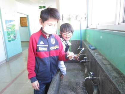 4年生が外から帰り、手洗い・うがいをしようと水道の蛇口をひねると、出てきたのは水ではなく氷。