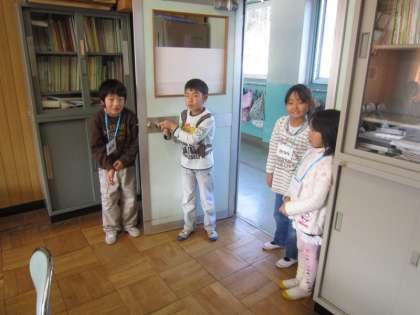 写真上:控え室である会議室に、照れながらも迎えに行く3年生代表。