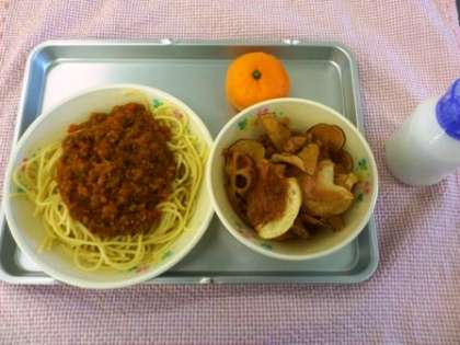 1月17日のこんだては、スパゲティーミートソース・3、4年生のリクエストおかず・牛乳でした。