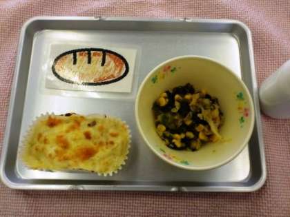 25日のこんだては、ダイスチーズパン・エビグラタン・わかめサラダ・牛乳でした。