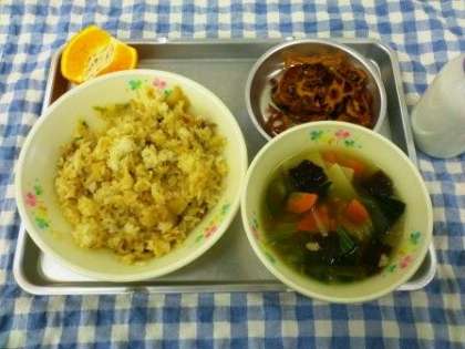 6日のこんだては、キムチチャーハン・冬のワンタンスープ・2年2組のリクエスト・くだもの(ぽんかん1/2)・牛乳でした。
