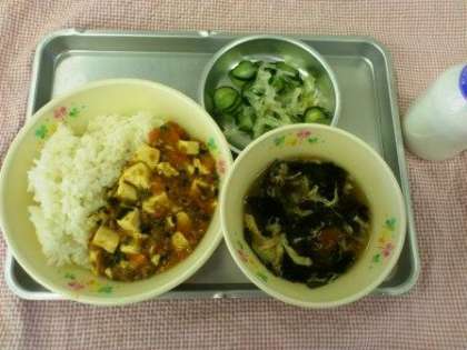 13日のこんだては、マーボー丼・中華スープ・大根ときゅうりのゆず風味・牛乳でした。