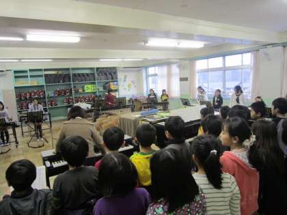 いろいろな楽器を使い、みんなで心を合わせて演奏する姿に、じっと聞き入る3年生の姿がありました。