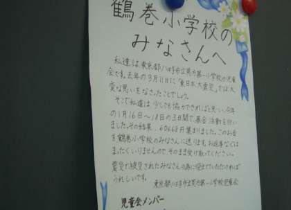 18日(土)に蓑輪PTA会長と平田副校長とで仙台市立鶴巻小学校へ届ける義援金額の報告と、届けることの承認がされました。