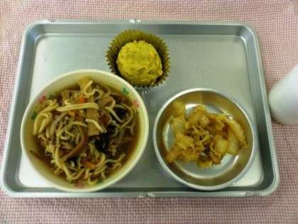 今日のこんだては、2年1組のリクエスト・ピリカラ白菜・スイートポテト・牛乳です。