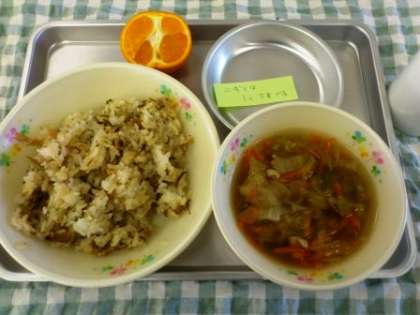 今日のこんだては、ししじゅうし・くずきりスープ・ニギスの磯辺揚げ・くだもの(たんかん1/2)・牛乳です。