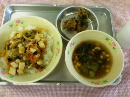 7日のこんだては、豆腐チゲ丼・春雨スープ・がんも焼き・牛乳でした。