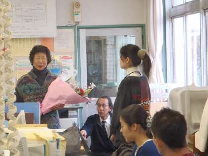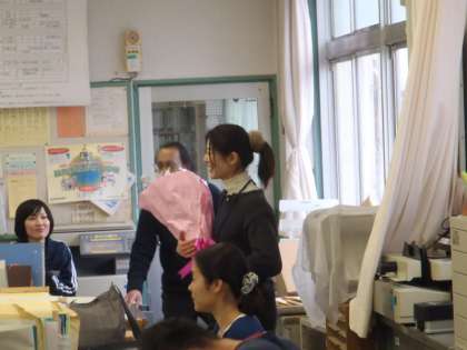親睦会から花束が送られました。プレゼンターは、少人数算数指導の後藤先生です。(中)