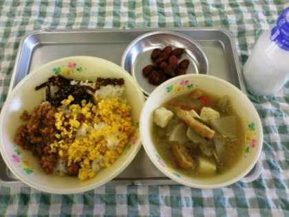 今日のこんだては、三色丼・みそけんちん・金時豆の甘煮・牛乳です。