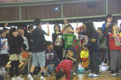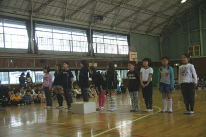 写真下:ゲーム。じゃんけんゲームをみんなでしました。1年生の代表とじゃんけんしかちだけが残っていきます。負けて悔しさのあまり体育館の床にしゃがみ込む児童もいました。