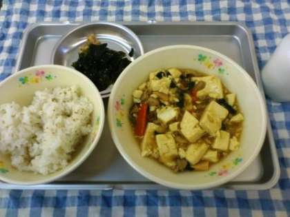 今日のこんだては、ごまごはん・豆腐のカレー煮・豚わか炒め・牛乳です。