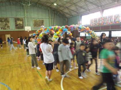 6年生に手をつないでもらい、アーチの下をくぐって入場です。(写真上・下)