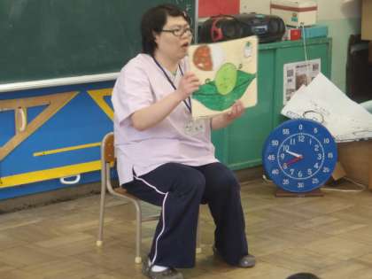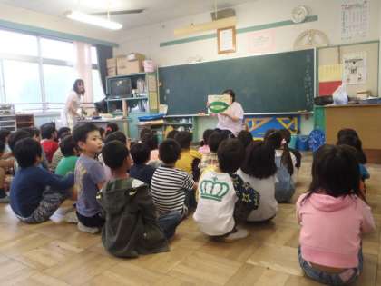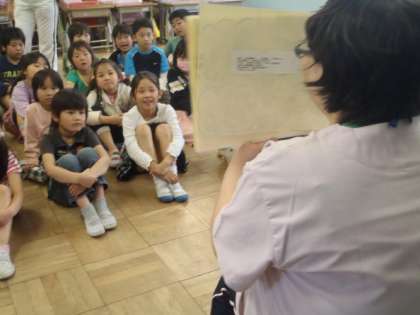 2年生は興味津々。ニコニコしながら紙芝居を楽しみました。