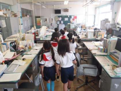 「ここは職員室です。 先生達の部屋です。会議をしたり印刷をしたりします。」