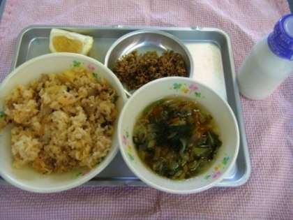 今日の給食は、キムタクチャーハン・春雨スープ・小魚のごまがらめ・くだもの(ニューサマーオレンジ1/4)・牛乳です。