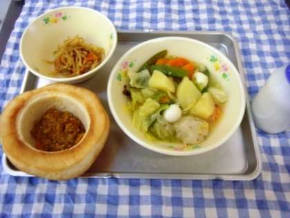 今日の給食は、お皿パン・カレーミート・野菜のスープ煮・もやしナムル・牛乳です。